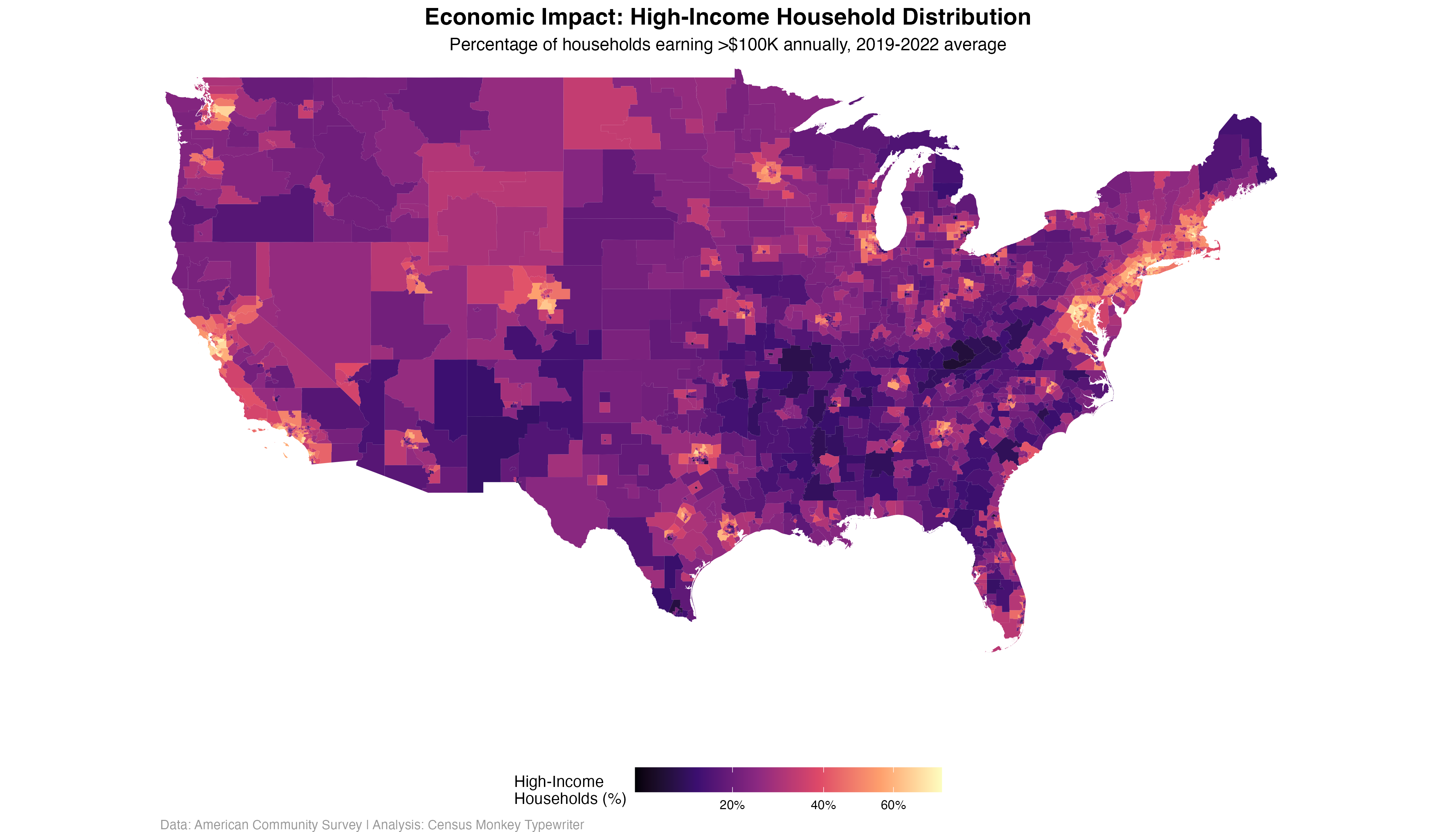 Figure 4: Economic Impact - High Income Distribution - Spatial correlation between high-income household rates and migration patterns reveals complex economic consequences of temporary residence.