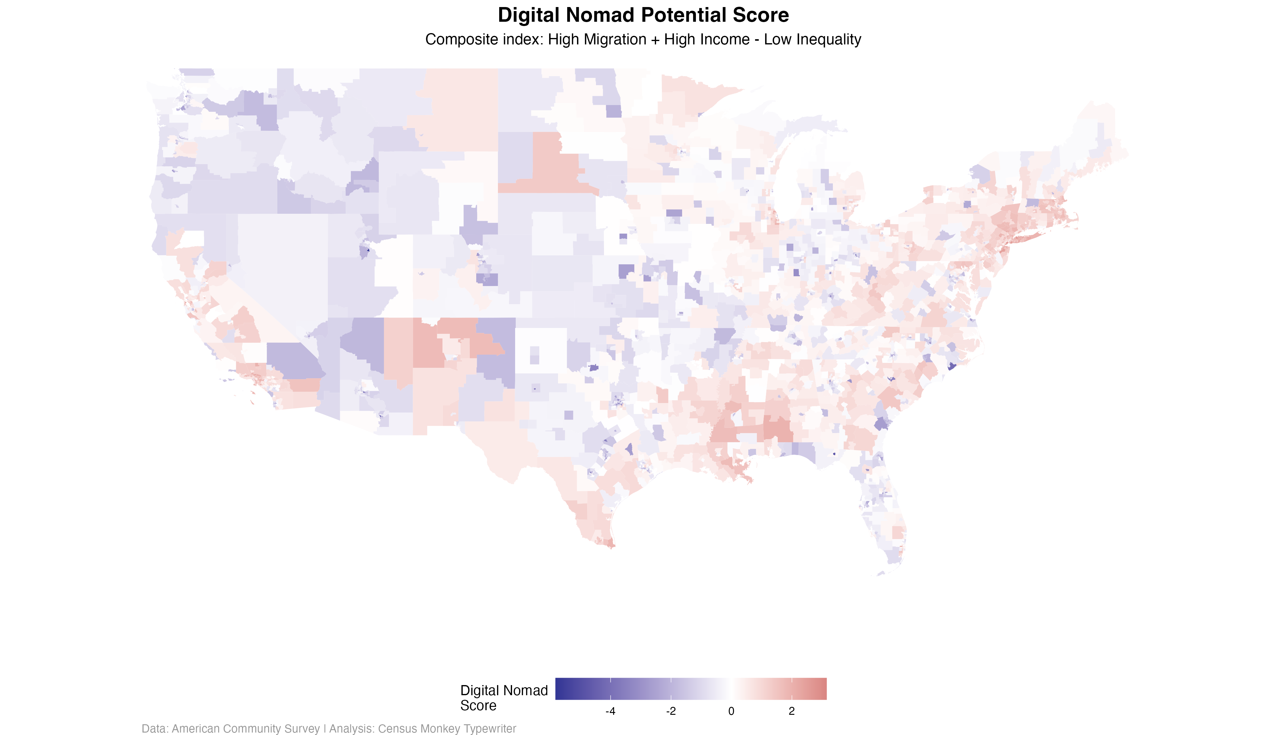 Figure 6: Digital Nomad Score - Composite potential score identifying optimal combinations of migration, income, and equality across American destinations.