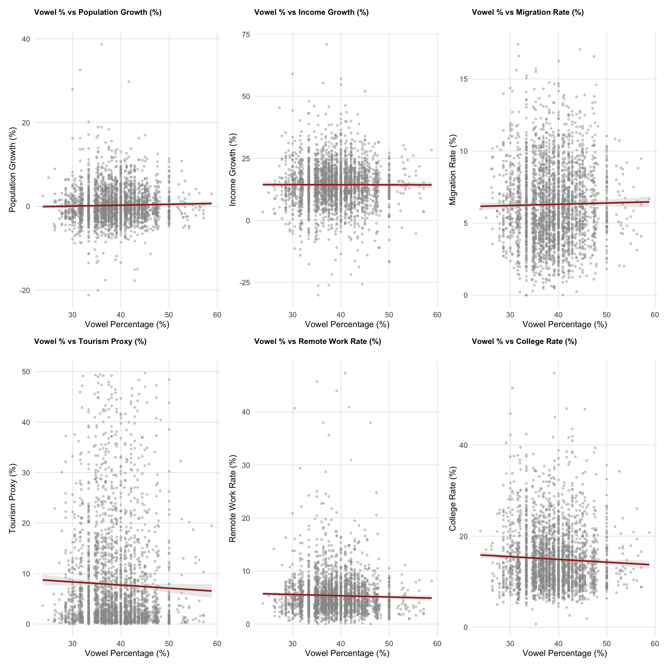These bivariate explorations confirm that vowel percentage shows the strongest relationship with population growth, while relationships with other outcomes are weaker or even negative. The education relationship deserves particular attention—it suggests that areas with “prettier” names might prioritize different values than academic achievement.