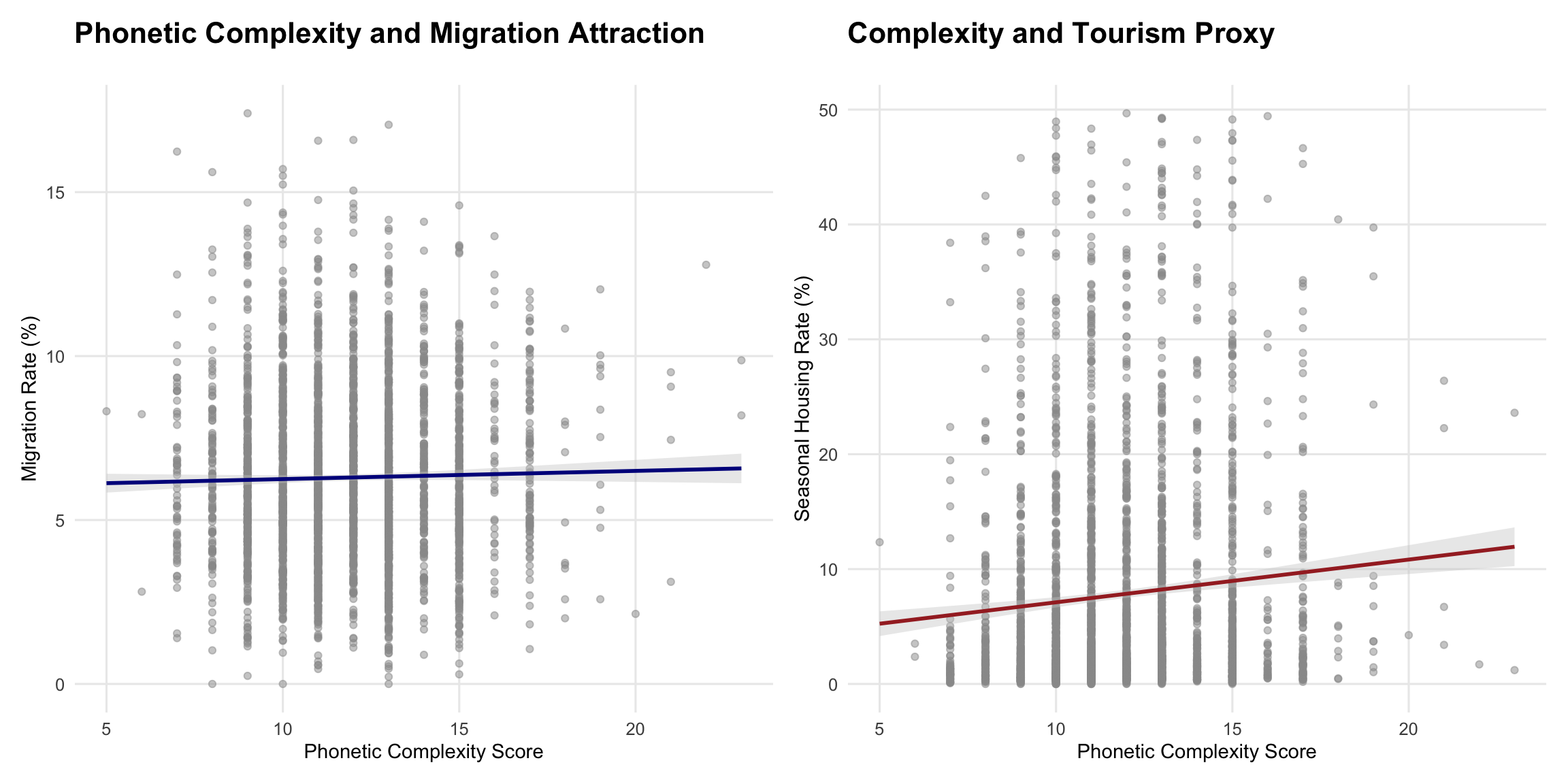 Phonetic complexity—measured by the frequency of vowel-consonant alternations—shows intriguing patterns. Counties with more complex phonetic structures tend to attract higher migration rates, perhaps because complex names signal cultural diversity and cosmopolitan appeal. The relationship with tourism proxies (seasonal housing) is even stronger, suggesting that phonetic complexity might serve as a subconscious marker of “interesting” places.