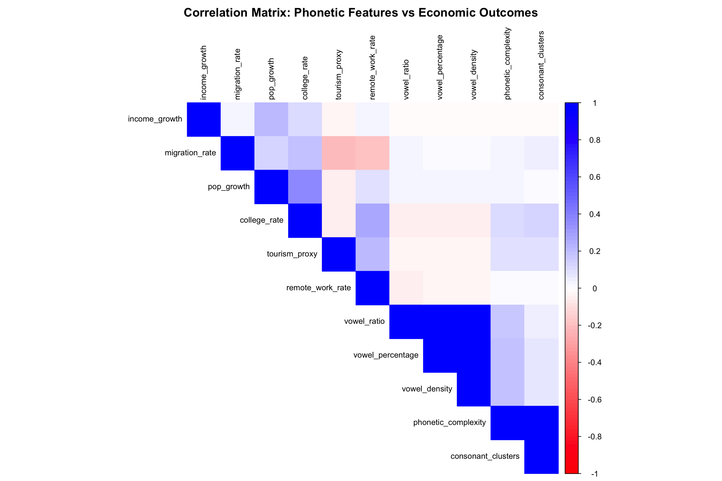 The correlation matrix reveals that phonetic complexity shows the strongest relationships with economic outcomes—particularly with tourism proxies and educational attainment. This suggests that linguistic sophistication, rather than simple vowel content, might be the more important factor in place perception.