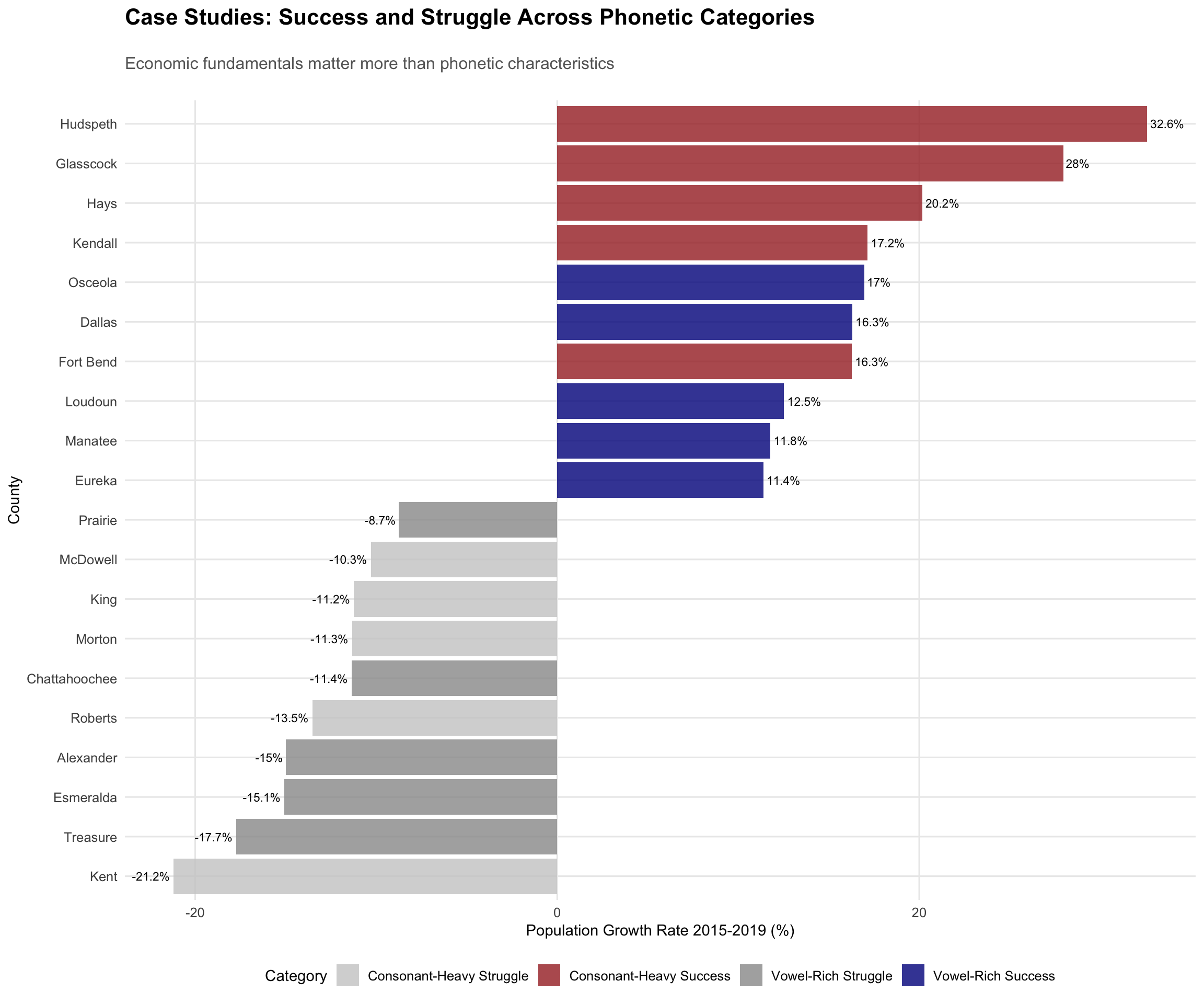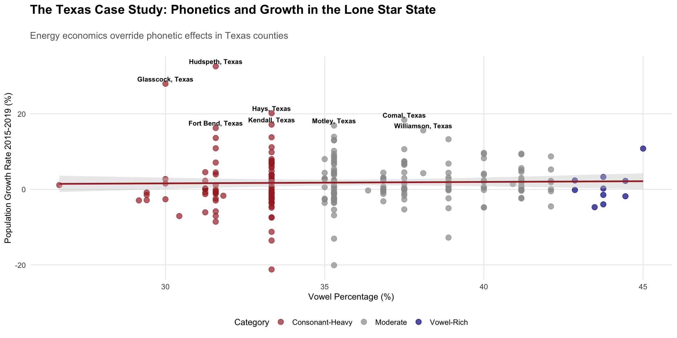 Texas emerges as the great equalizer: both vowel-rich and consonant-heavy counties achieve spectacular growth rates when underlying economic conditions align. Hudspeth, Glasscock, and Hays counties—spanning the full phonetic spectrum—all exceed 20% population growth, demonstrating that oil, gas, and technology sectors care little for linguistic aesthetics.
