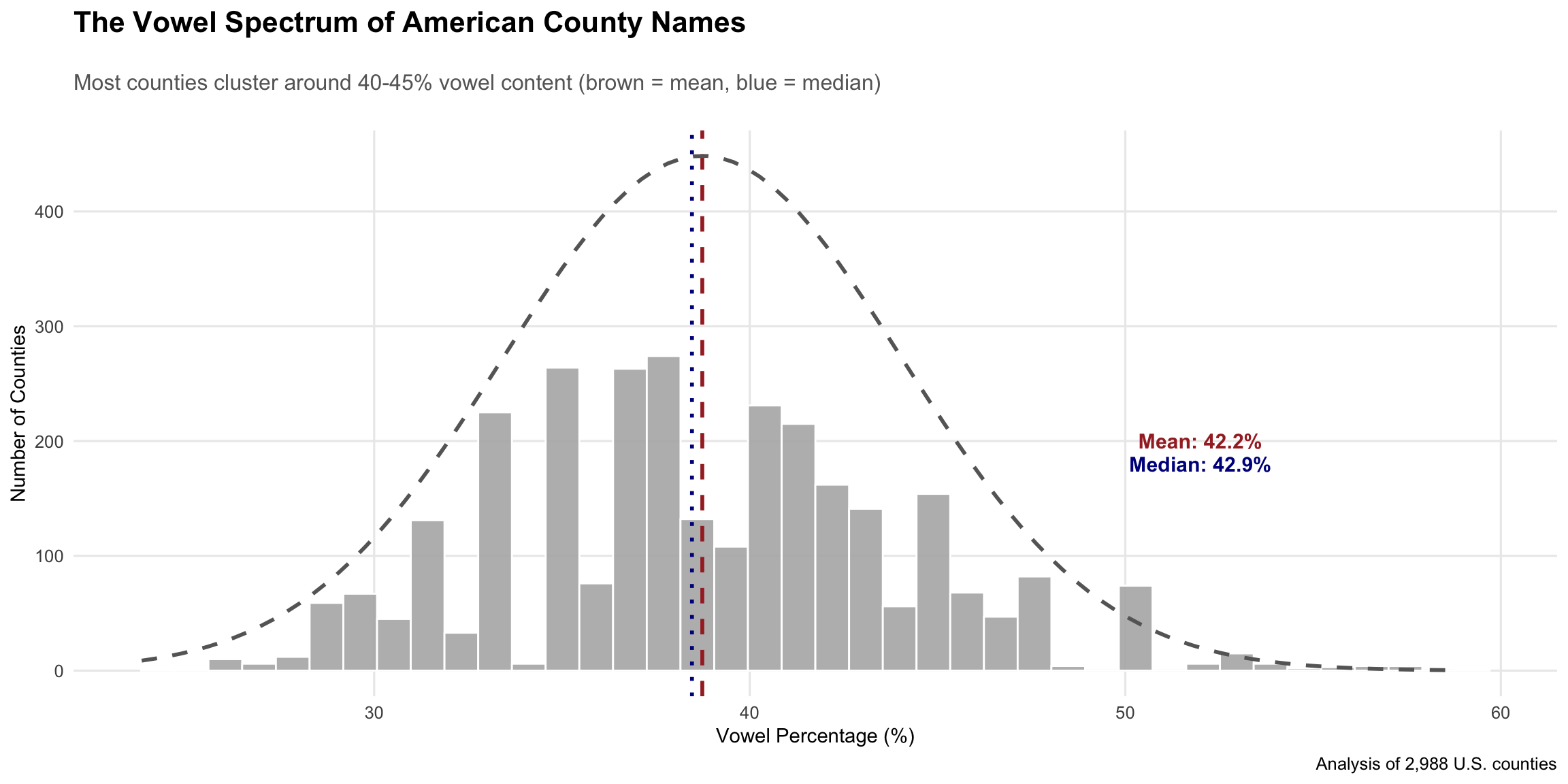 The vowel content of American county names follows a surprisingly normal distribution, with most counties settling into a comfortable 40-45% vowel range. This suggests that English phonetic patterns naturally gravitate toward a balanced sound structure—neither the vowel-heavy musicality of Hawaiian names nor the consonant-dense efficiency of Germanic influences dominate the American toponymic landscape.