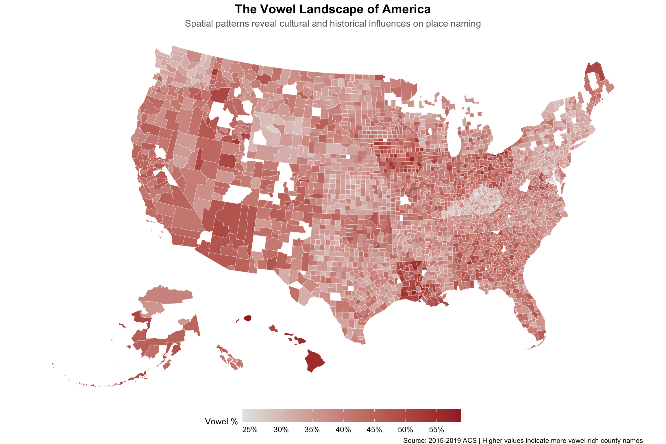 Regional patterns reveal America’s linguistic heritage: the South, with its English colonial roots and later settlement patterns, shows lower vowel percentages—think “McCracken County” and “Culpeper County.” The West, influenced by Spanish toponymy and Native American names, tilts toward vowel-rich appellations like “Saguache County” and “Ouachita Parish.”