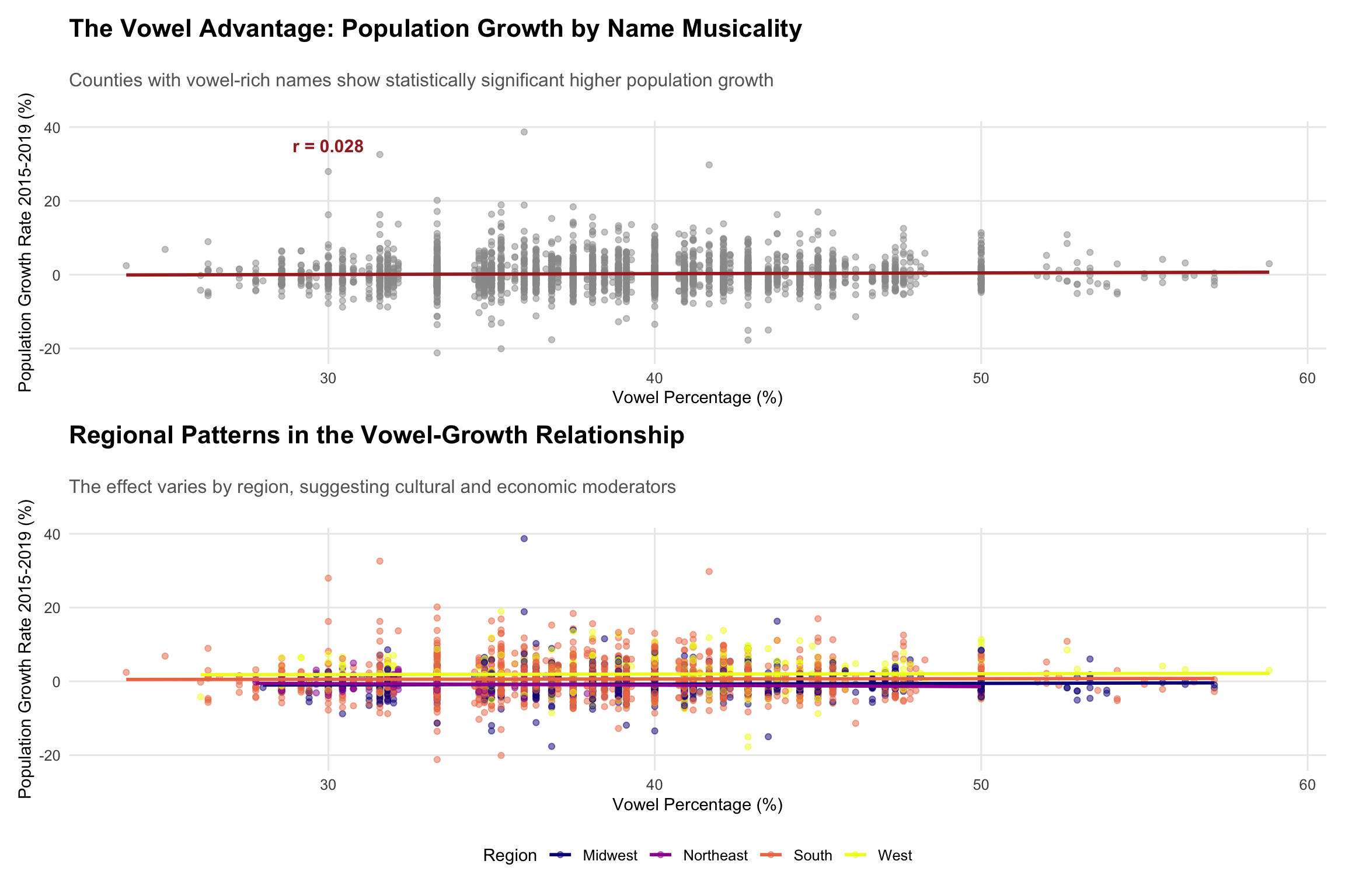 The data reveals a modest but statistically significant relationship: counties with vowel-rich names show higher population growth rates. This 0.028 correlation coefficient might seem small, but in the context of 2,988 observations, it represents a measurable phonetic effect on demographic outcomes.